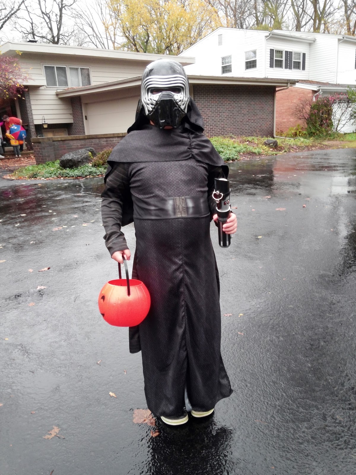 Kai was dressed as Kylo Ren, who apparently will be a Darth Vader-like villain in the upcoming new Star Wars movie. He received a number of positive comments about his costume as we went around and a number of folks showed off their own Star Wars apparel to him. I hadn't thought that he particularly cared about what others thought about his Halloween costume, but he remarked that "this is the first time everyone like my costume."